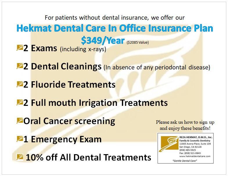 Our in-office insurance plan at Hekmat Dental Care provides comprehensive coverage for dental exams, cleanings, x-rays, and more at an affordable annual rate. This plan offers peace of mind and significant savings for individuals and families without dental insurance.